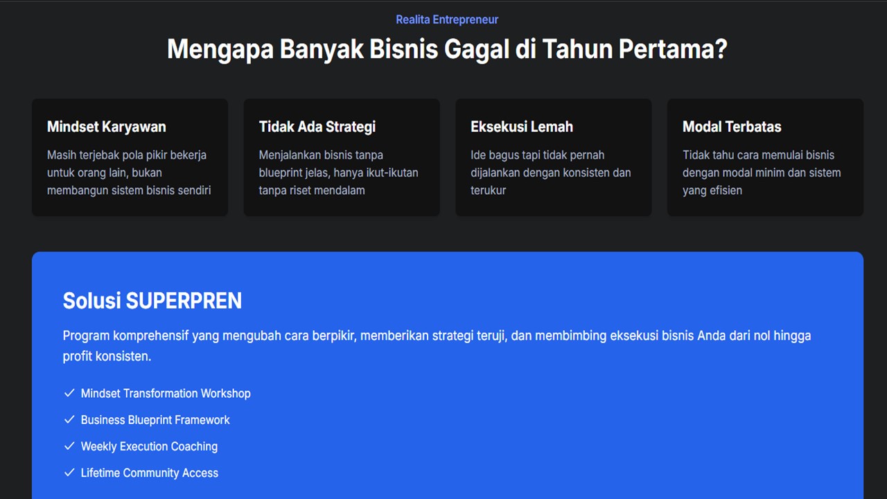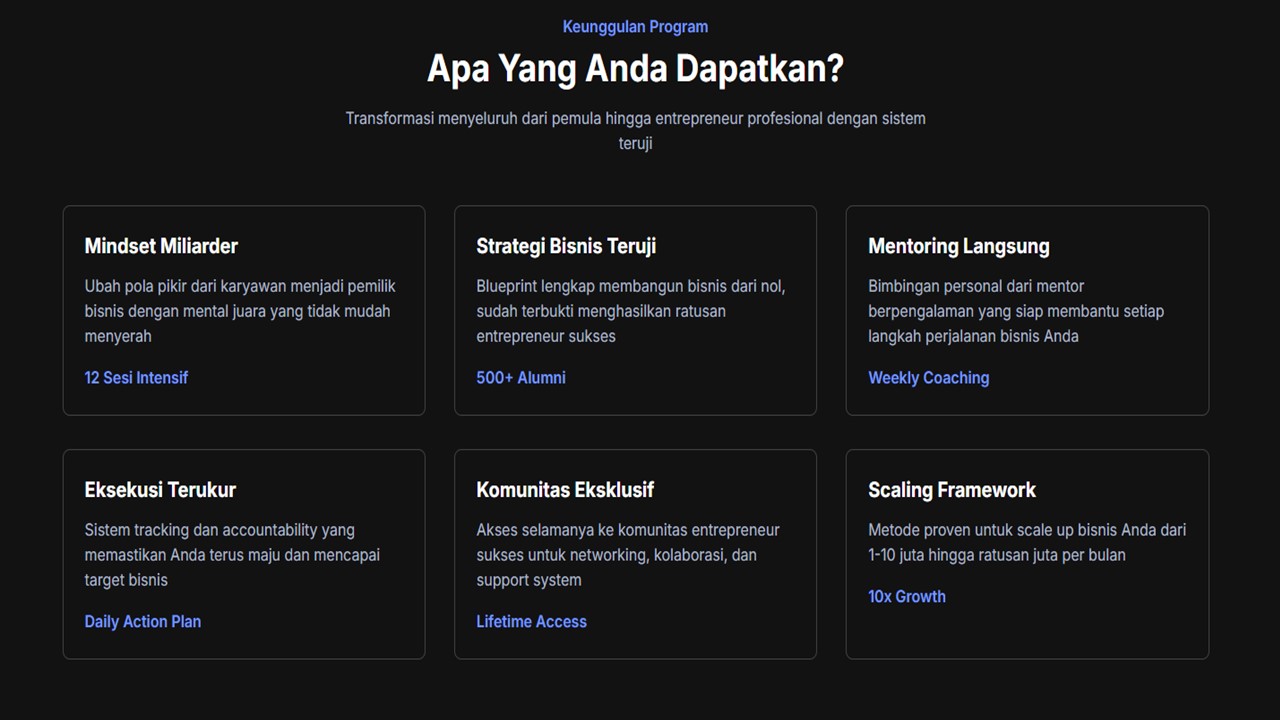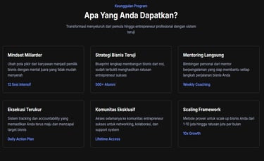 Program intensif 12 minggu yang mengubah pemula menjadi pengusaha sukses dengan mindset dan strategi bisnis yang tepat.